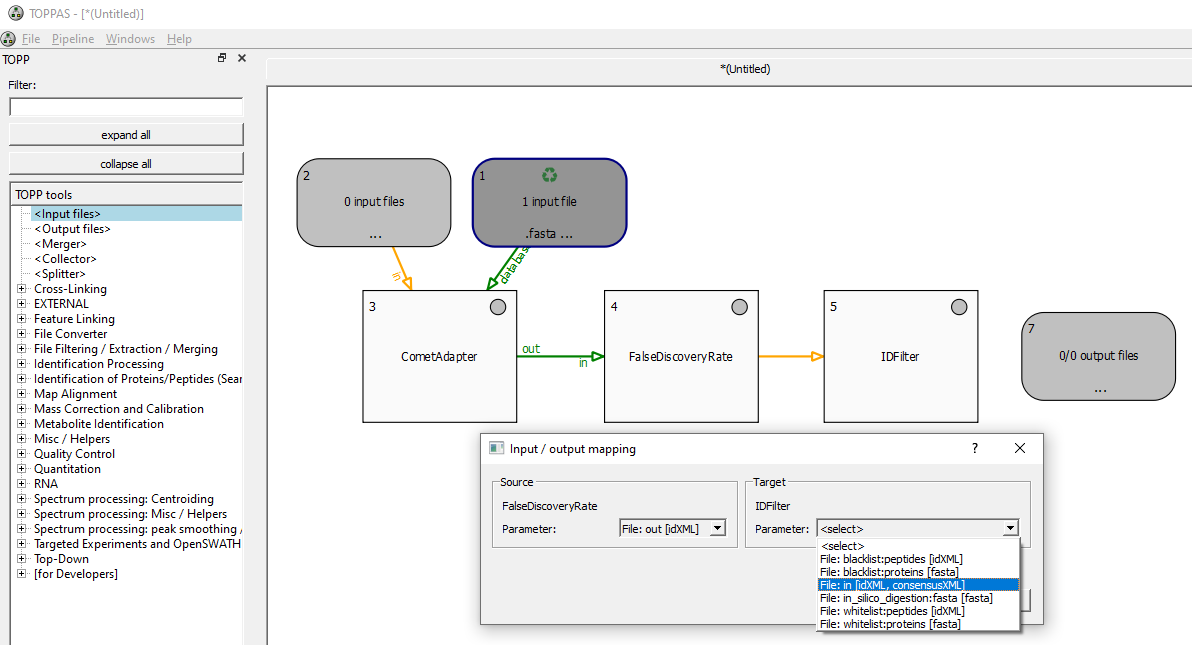Next, the user has drawn some connections between the tools which determine the data flow of the pipeline. Connections can be drawn by first deselecting the desired source node (by left-clicking anywhere on the white background) and then dragging (i.e. left-click and keep the button pressed) the mouse from the source to the target node (if a selected node is dragged, it is moved on the canvas instead). When a connection is created, and the source (, or the target) has more than one output (, or input) parameter, an input/output parameter mapping dialog shows up and lets the user select the output parameter of the source node and the input parameter of the target node for this data flow - shown here for the connection between FalseDiscoveryRate and IDFilter. If the file types of the selected input and output parameters are not compatible with each other, TOPPAS will refuse to add the connection. It will also refuse to add a connection if it would create a cycle in the workflow, or if it just would not make sense, e.g., if its target is an input file node. The connection between the input file node (#1) and the CometAdapter (#5) tool is painted yellow which indicates it is not ready yet, because no input files have been specified.