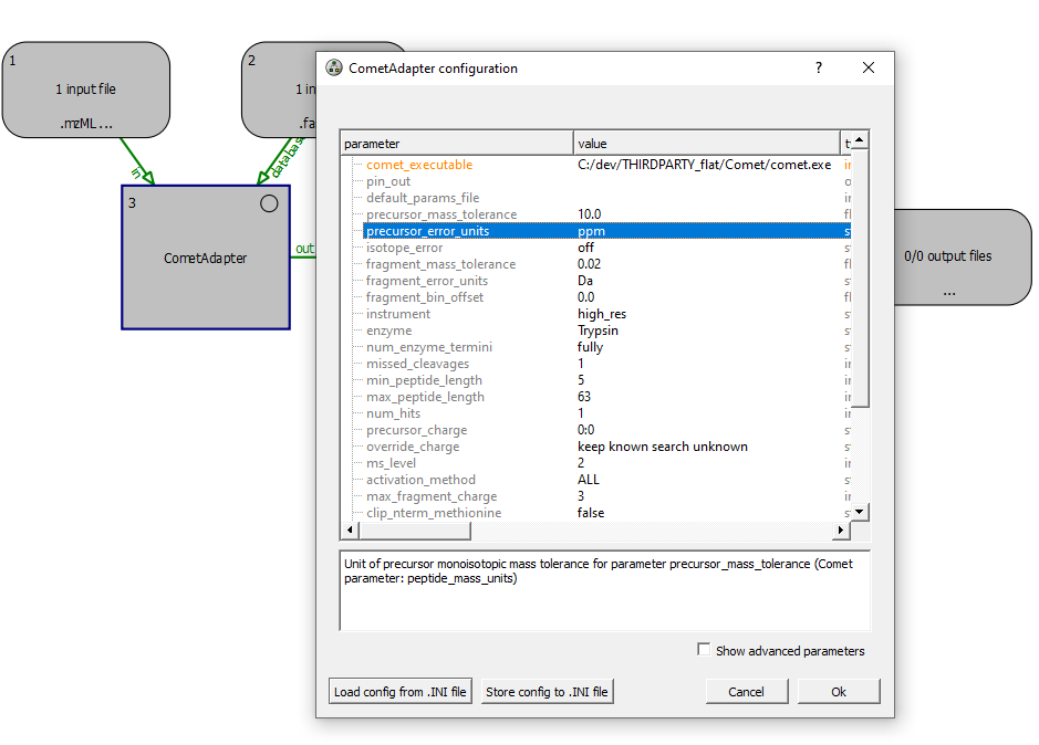 The following figure shows a possible next step: the user has double-clicked one of the tool nodes in order to configure its parameters. By default, the standard parameters are used for each tool. Again, this can also be done by selecting Edit parameters from the context menu of the tool.