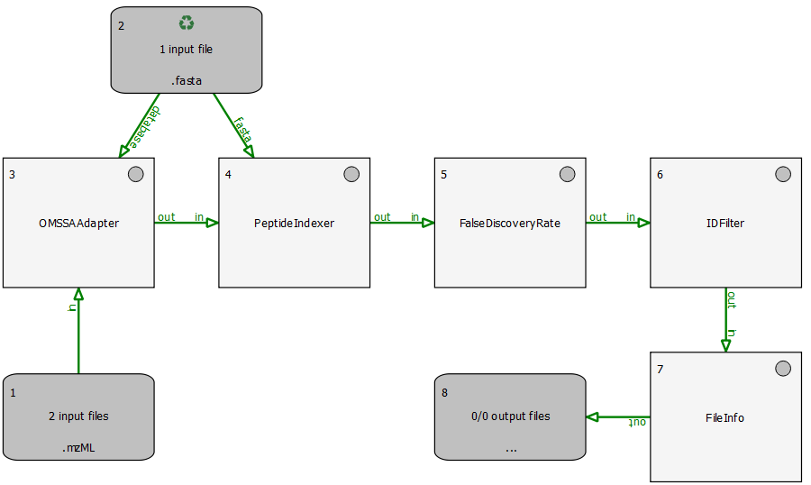 We use the search engine OMSSA (Geer et al., 2004) for peptide identification. Therefore, OMSSA must be installed and the path to the OMSSA executable (omssacl) must be set in the parameters of the OMSSAAdapter node.